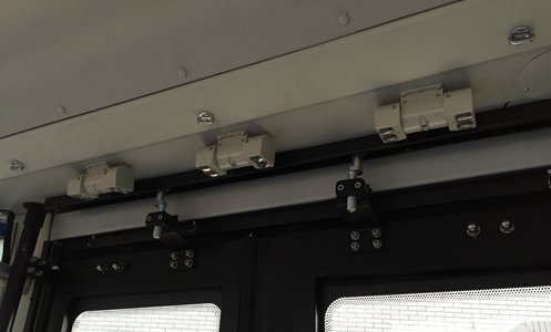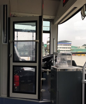 相比柴油動(dòng)力車,純電動(dòng)公交車在配置上可算是“高精尖”。車子前后車門上方,共裝了5個(gè)攝像頭一樣的“紅外客流調(diào)查儀”,用于統(tǒng)計(jì)上下車的客流數(shù)量,據(jù)稱準(zhǔn)確度達(dá)95%。車內(nèi)前置的攝像頭,可拍到車前5米范圍的路況。另外,駕駛位加裝了塑料透明的隔離門,可從內(nèi)上鎖,形似“單人間”,以保護(hù)司機(jī)的人身、財(cái)產(chǎn)安全。