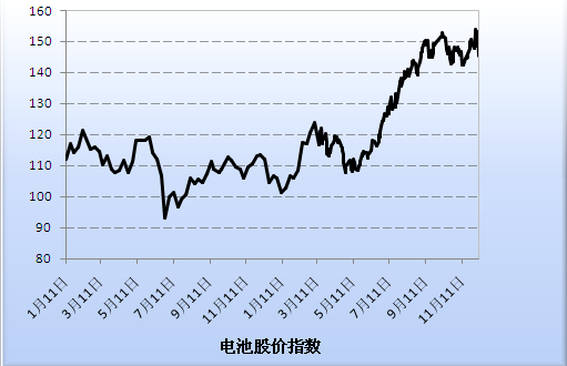 關(guān)于電池股價(jià)指數(shù) ●電池股價(jià)指數(shù)是71只上市公司股票走勢(shì)所綜合形成的,分別涉及到鋰電池、錳酸鋰、鈷酸鋰、碳酸鋰、磷酸鐵鋰、三元材料、負(fù)極材料、電解液、六氟磷酸鋰、隔膜、電解銅箔、燃料電池、鎳氫電池、鉛酸電池和鎳氫電池材料。 ●指數(shù)以2011年年終收盤日為基日,設(shè)為100點(diǎn)。指數(shù)的漲跌基本可以反映電池行業(yè)的整體趨勢(shì),供大家參考。