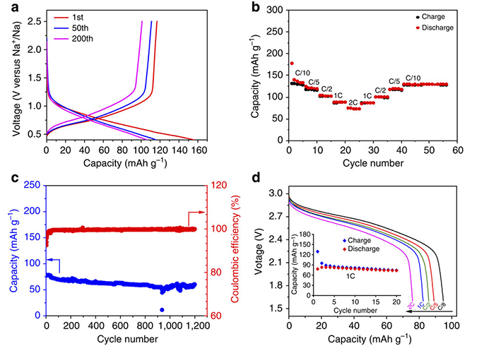 (c)2C倍率下的長(zhǎng)循環(huán)性能,(d)Na3V2(PO4)3/C//Na0.66[Li0.22Ti0.78]O2全電池電化學(xué)性能