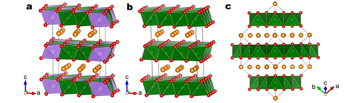 圖1 計(jì)算模型:(a) P2-Na[Li0.33Ti0.67]O2,(b) P2-NaTiO2,(c) O3-NaTiO2。橙色、紫色、綠色和紅色分別代表鈉、鋰、鈦和氧