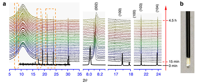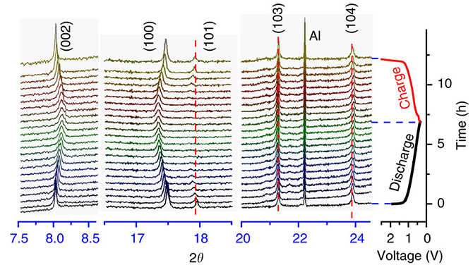 圖7. 化學(xué)鈉化過程中P2-Na0.66[Li0.22Ti0.78]O2材料的結(jié)構(gòu)變化:同步輻射原位XRD圖譜