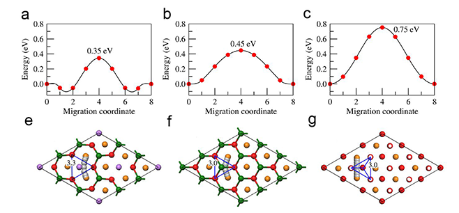 圖2 Na+離子擴(kuò)散活化能和擴(kuò)散路徑:(a, e) P2-Na[Li0.33Ti0.67]O2,(b, f) P2-NaTiO2,(c, g) O3-NaTiO2
