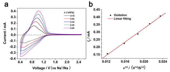 圖8 Na+離子表觀擴(kuò)散系數(shù)測(cè)量:(a)不同掃描速度的CV曲線,(b)氧化峰電流與掃描速度(v1/2)的關(guān)系