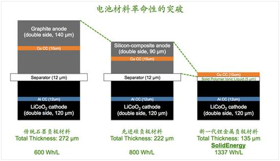 傳統(tǒng)的鋰離子電池采用石墨負(fù)極僅能達(dá)到少于600Wh/L的能量密度;先進(jìn)的硅負(fù)極電池僅取得800Wh/L的能量密度,而超薄鋰金屬負(fù)極電池能超過(guò)1000Wh/L的能量密度。雖然目前許多鋰金屬負(fù)極電池例如鋰空氣、鋰硫電池離實(shí)際應(yīng)用還非常遠(yuǎn),麻省固體能源公司使用成熟的鋰鈷氧正極,成功的在2Ah的電芯上實(shí)現(xiàn)了1337Wh/L的能量密度,并將在2016年大規(guī)模應(yīng)用到消費(fèi)類電子產(chǎn)品。