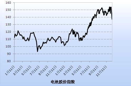 ●指數(shù)以2011年年終收盤日為基日,設(shè)為100點。指數(shù)的漲跌基本可以反映電池行業(yè)的整體趨勢,供大家參考。