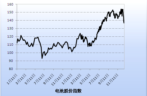 ●指數(shù)以2011年年終收盤日為基日,設(shè)為100點。指數(shù)的漲跌基本可以反映電池行業(yè)的整體趨勢,供大家參考。