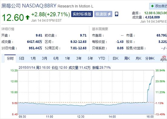 受此影響,黑莓股價(jià)在紐約市場(chǎng)的午后交易中大幅上漲最高30%,交投量龐大。該股收盤上漲2.89美元,報(bào)12.60美元,漲幅為29.71%,盤中最高觸及12.63美元,創(chuàng)下52周新高。在隨后截至美國東部時(shí)間16:31(北京時(shí)間15日5:31)為止的盤后交易中,黑莓股價(jià)再度上漲1.05美元,至12.92美元,漲幅為8.85%。過去52周,黑莓的最高價(jià)為12.63美元,最低價(jià)為7.01美元。