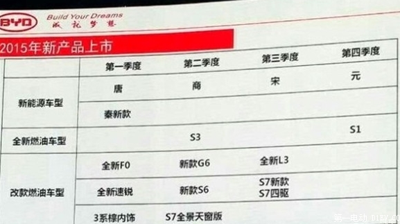 日前,我們獲得了一組比亞迪2015年新產(chǎn)品的計(jì)劃。據(jù)了解,在2015年,比亞迪在每個(gè)季度都將有新車型推出,類型涵蓋了傳統(tǒng)汽油車以及新能源車型共14款。