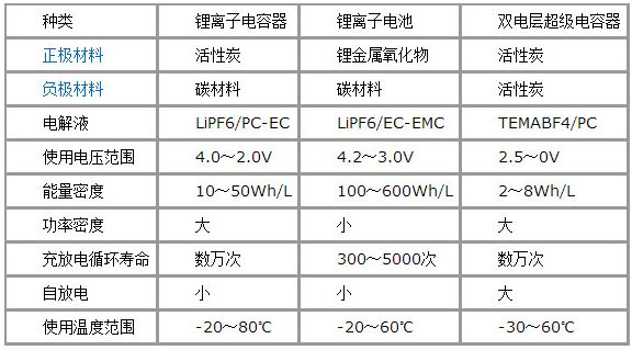 表1:鋰離子電容器與鋰離子電池、雙電層超級電容器的構(gòu)成材料比較