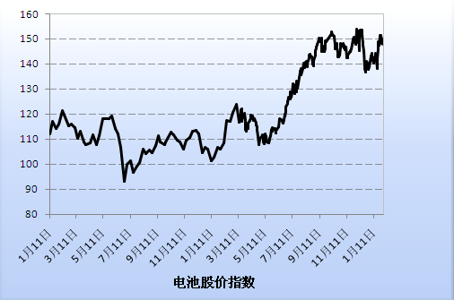 ●指數(shù)以2011年年終收盤日為基日,設(shè)為100點。指數(shù)的漲跌基本可以反映電池行業(yè)的整體趨勢,供大家參考。