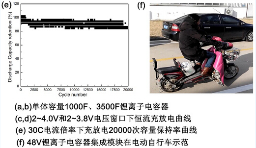 近日,在國家高技術研究發(fā)展計劃“863”項目及青島市戰(zhàn)略性新興產(chǎn)業(yè)培育計劃項目的支持下,依托中國科學院青島生物能源與過程研究所建設的青島儲能產(chǎn)業(yè)技術研究院高工韓鵬獻帶領的研究組,與工程師姚建華一起,采用石墨烯基復合材料路線,攻克了程序化預嵌鋰、正負極漿料在特殊集流體上涂布、軟包裝器件脹氣抑制、模塊化系統(tǒng)集成等多個工程化關鍵技術難點,開發(fā)出單體150F、1000F、2000F、3500F等容量可控的鋰離子電容器器件,基于電芯的能量密度達45Wh/L以上,在30C倍率下充放電10000次容量保持率達94.7%、20000次容量保持率達84.3%以上。同時,通過采用模塊化系統(tǒng)集成技術,成功在電動自行車上進行了示范應用,相關技術在國內(nèi)處于領先水平。