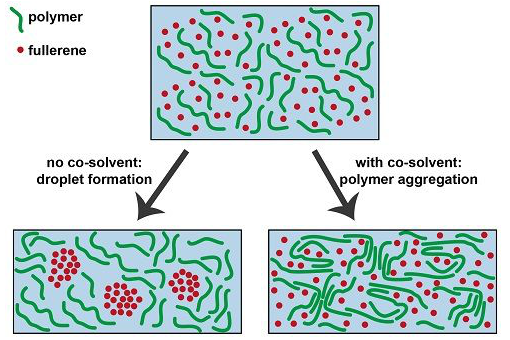 圖中顯示在塑料太陽能電池生產(chǎn)過程中,共溶劑對于兩種塑料元件(聚合物和富勒烯分子)溶液的影響。具有共溶劑液滴的富勒烯分子使太陽能電池的效率受限;而添加共溶劑的聚合物分子更快形成摺疊結(jié)構(gòu),避免了氣泡形成。