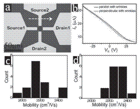 生長石墨烯所用的金屬襯底在制備過程中會(huì)在表面形成有序的形貌起伏,這種結(jié)構(gòu)會(huì)導(dǎo)致轉(zhuǎn)移后的石墨烯薄膜產(chǎn)生大量有序排列的褶皺。四室研究團(tuán)隊(duì)通過制備出特殊結(jié)構(gòu)的石墨烯射頻器件,圍繞褶皺對(duì)石墨烯中載流子傳輸?shù)挠绊懻归_了研究,發(fā)現(xiàn)這種有序的褶皺會(huì)導(dǎo)致石墨烯中載流子的傳輸具有各向異性的特點(diǎn):平行于褶皺方向的載流子遷移率比垂直方向的顯著提高。該發(fā)現(xiàn)為制備高性能的石墨烯射頻器件提供了重要的參考依據(jù)。