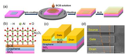 在石墨烯射頻器件的制備過程中,已有的柵介質(zhì)制備方法在工藝的可控性和器件性能方面具有一定的缺陷。四室研究團(tuán)隊(duì)利用旋涂的方法在石墨烯表面形成BCB薄膜,并以此作為種子層進(jìn)行了氧化鋁介電層的沉積生長。該方法不僅具有極好的工藝可控性,由于BCB特殊的化學(xué)結(jié)構(gòu),避免了對(duì)石墨烯性能的不利影響,實(shí)現(xiàn)了高性能石墨烯射頻器件的制備。