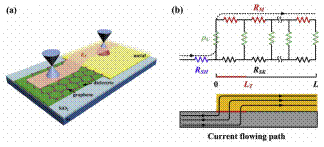 石墨烯與金屬電極之間的接觸電阻會(huì)影響石墨烯射頻器件的柵控,從而對(duì)器件的頻率特性產(chǎn)生不利影響。作為傳統(tǒng)薄膜材料研究方法的延伸,目前主要通過TLM方法對(duì)石墨烯和金屬之間的接觸進(jìn)行表征和測(cè)量。四室研究團(tuán)隊(duì)通過測(cè)定石墨烯接觸區(qū)和非接觸區(qū)材料的薄膜電阻,發(fā)現(xiàn)兩者有很大的差異。進(jìn)一步的理論分析表明,石墨烯不同區(qū)域薄膜電阻的差異會(huì)導(dǎo)致傳統(tǒng)的TLM方法提取得到的接觸電阻與實(shí)際值有很大偏差,該發(fā)現(xiàn)對(duì)測(cè)試方法的改良和石墨烯射頻器件性能的優(yōu)化具有重要價(jià)值。