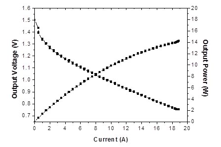中國(guó)科學(xué)院寧波材料技術(shù)與工程研究所動(dòng)力鋰電池工程實(shí)驗(yàn)室在優(yōu)化陰極空氣擴(kuò)散電極的結(jié)構(gòu)與制備工藝,以及開(kāi)發(fā)高性能的錳氧化物氧還原催化劑的基礎(chǔ)上,成功研制出1000Wh鎂空氣電池樣機(jī),詳見(jiàn)圖1所示。該電池由5個(gè)單體電池串聯(lián)而成,以AZ31鎂合金為陽(yáng)極,以10%的NaCl溶液為電解液,以上述空氣擴(kuò)散電極和錳氧化物催化劑為陰極。該鎂空氣電池的外觀尺寸為200×150×150 mm3,重量為2.3 kg,能量密度可達(dá)430 Wh/kg,最大輸出功率可達(dá)80W,其單體電池的I-V曲線如圖2所示。上述鎂空氣電池具有較好的商業(yè)化前景,可應(yīng)用為野外供電電源、移動(dòng)電源、備用電源和應(yīng)急電源等。
