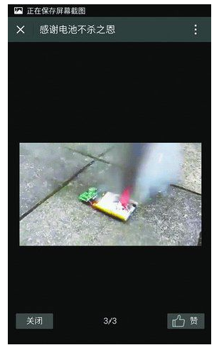 這組動態(tài)圖分為三部分。一開始,有人拿著小刀,對著地面上的看似手機鋰電池的電池猛戳幾下,將電池表面戳破了幾個口子;隨后,有氣體從口子中冒出,越噴越猛,氣體也由白轉黑;最后,口子中開始冒火花,然后噴出火舌,整塊電池爆燃。整個過程不到半分鐘,文字注解稱,圖中是一塊鋰電池。