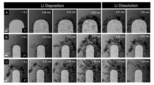 如圖所示,鋰(圖中黑色細(xì)毛狀物體)會(huì)在每個(gè)放電周期后都會(huì)暫時(shí)沈積上電極上,但不會(huì)完全溶解。如此一來,再多重復(fù)幾次每次可以利用的鋰就會(huì)愈來愈少,亦即為電量降低。