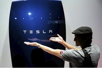 2015年4月30日,在加州霍桑市特斯拉汽車公司總部舉辦的一次活動(dòng)上,與會(huì)者在該公司新推出的Powerwall家用電池前留影。Powerwall是特斯拉為家庭、企業(yè)和電力公司推出的一款電池組,特斯拉對(duì)其寄予了高度期望,希望它能擴(kuò)展到電動(dòng)汽車以外的領(lǐng)域。