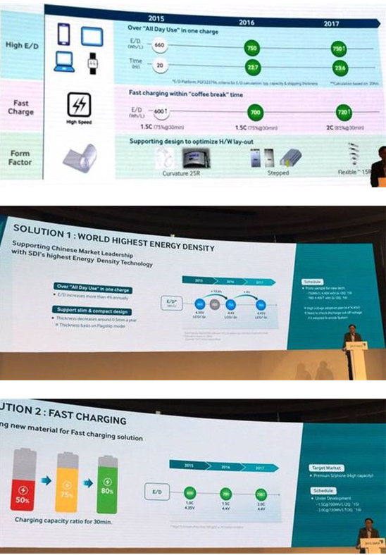 在快速充電方面,三星表示,他們可以在30分鐘內(nèi)充到整個(gè)電池能量的75%,爭(zhēng)取到2017時(shí),30分鐘充到電池容量的80%。正在研究的包括今年將推出的1.5C&700wh/L電池,以及明年下半年推出的2.0C&720wh/L電池。
