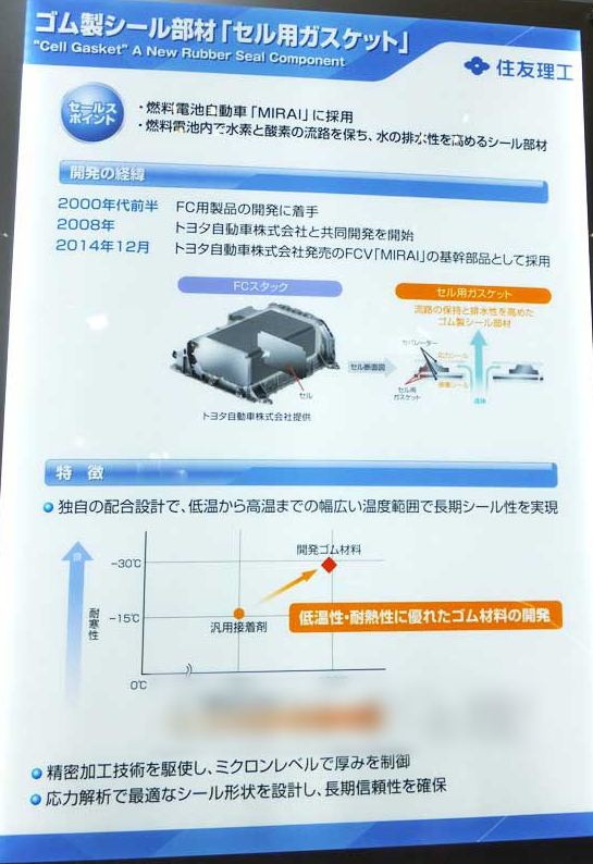住友理工在“人與車科技展2015”(5月20~22日于太平洋橫濱國際會展中心舉行)上,首次展出了向豐田燃料電池車(FCV)“MIRAI”供應(yīng)的燃料電池用橡膠制粘合材料“電池單元用密封墊片”。