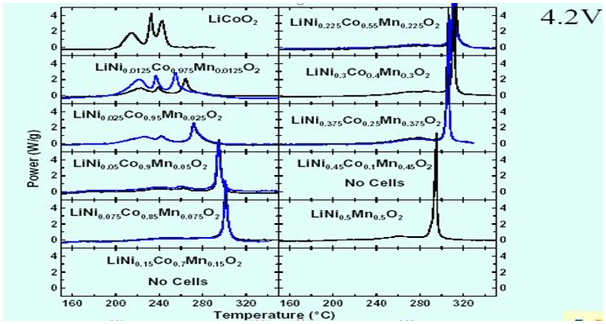 2、電芯被高溫加熱, 當(dāng)電芯被高溫加熱時,電解液會汽化同時還會分解,電芯內(nèi)部壓力增大,電芯內(nèi)部的隔離膜可能熔解導(dǎo)致電芯內(nèi)部短路引起燃燒, 同時陰極材料在充滿電時,在一定溫度下,會發(fā)生自催化反應(yīng),出現(xiàn)燃燒。電芯電壓越高,抗高溫的時間就越短。 下圖為不同材料的焦耳熱特性曲線: