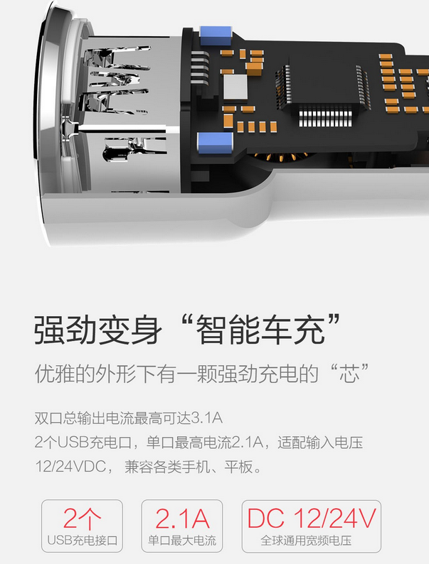 在車充性能方面,內(nèi)置了AnaNaviTek諾肯科技高性能DC-DC主控芯片,輸入為12-24V,支持市面上主流的車型;雙USB輸出,滿足兩臺手機同時充電,聯(lián)合輸出可達5V 3.1A( 15.5W),單口輸出可達2.1A;每一路還具備智能識別功能,可兼容蘋果和安卓設(shè)備??紤]到安全性,內(nèi)部電路設(shè)計有溫度、短路、過流等8項保護技術(shù)。