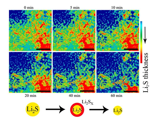 負(fù)載于單層石墨烯電極表面的Li2S材料在LiTFSI-DOL/DME電解液中活化過程的原位觀測SEM圖