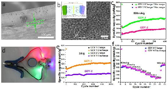 這些研究為石墨炔家族的儲(chǔ)鋰性能研究以及探索新型碳素儲(chǔ)能材料提供了理論依據(jù)和實(shí)驗(yàn)指導(dǎo)。研究表明,石墨炔是一種非常理想的儲(chǔ)鋰材料,且其獨(dú)特的結(jié)構(gòu)更有利于鋰離子在面內(nèi)和面外的擴(kuò)散和傳輸,這樣賦予其非常好的倍率性能,從實(shí)踐證明石墨炔是一種非常有前景的儲(chǔ)鋰能源材料,科學(xué)家也預(yù)測(cè)它在新能源領(lǐng)域?qū)a(chǎn)生非比尋常的影響。