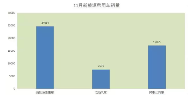 11月新能源車爆發(fā)增長,為經(jīng)濟穩(wěn)增長和轉型升級做出巨大貢獻。根據(jù)乘聯(lián)會廠家數(shù)據(jù),11月的新能源乘用車銷量24664臺,暴增2.4倍。其中插電混合動力達到7599臺,純電動車達到17065臺。