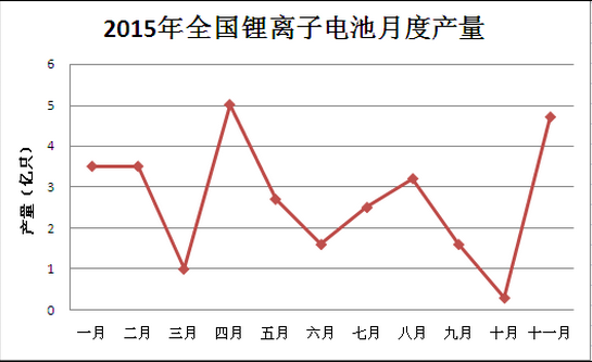 離子電池2015年的產(chǎn)量呈現(xiàn)出不穩(wěn)定狀態(tài),波動(dòng)幅度較大,其中三月到四月,十月到十一月的產(chǎn)量都是直線上升。