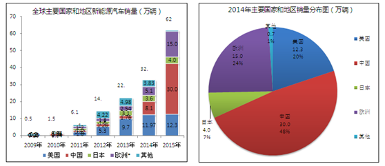 其中,美國、中國、日本、歐洲是新能源汽車主要的銷售市場,預計2015年美、中、日、歐占據(jù)了全球市場99%的銷量。