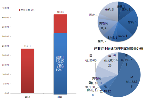 2015年產(chǎn)業(yè)鏈并購金額約400億元以上 產(chǎn)業(yè)鏈不同環(huán)節(jié)并購案例金額分布