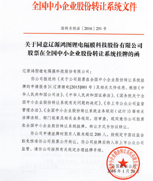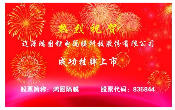 1月20日,遼源鴻圖鋰電隔膜科技股份有限公司(股票簡稱:鴻圖隔膜,股票代碼:835844)正式掛牌新三板。作為新能源材料業(yè)新三板上市的企業(yè),鴻圖隔膜的掛牌上市將迎來其發(fā)展史上的里程碑和新起點,開啟高速發(fā)展新紀(jì)元。
