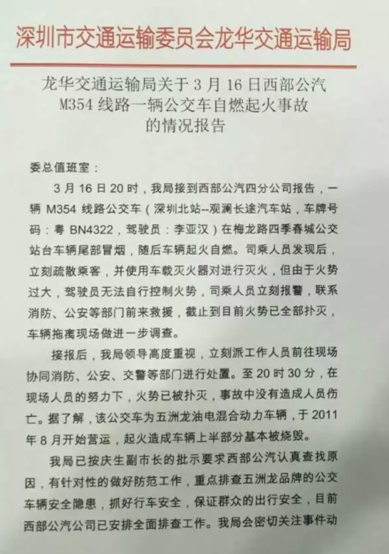 3月16日,深圳市交通運輸委員會龍華交通運輸局發(fā)布“關(guān)于3月16日西部公汽M354路一輛公交車自燃起火事故的情況報告”,報告指出,一輛M354路公交車在梅龍路四季春城公交站臺車輛尾部冒煙,隨后車輛起火自燃。司乘人員立刻報警,聯(lián)系消防、公安等部門前來救援,截至到目前火勢已全部撲滅。事故沒有造成人員傷亡。