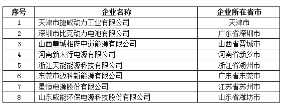 4月6日,工信部公示符合《汽車動力蓄電池行業(yè)規(guī)范條件》企業(yè)目錄(第三批),天津捷威動力、深圳比克動力電池、山西皇城相府中道能源、河南新太行電源、浙江天能能源、東莞邁科新能源、星恒電源、山東威能環(huán)保電源八家企業(yè)列入其中。