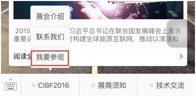 2. 關(guān)注后,請在訪問菜單“CIBF2016”中查找“我要參觀”(如圖2)。
