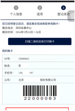 6. 調(diào)查問卷完成提交后出現(xiàn)注冊成功頁面,去展會現(xiàn)場可以憑借成功頁面的條形碼和卡號或者手機號換取參觀證(如圖6)。