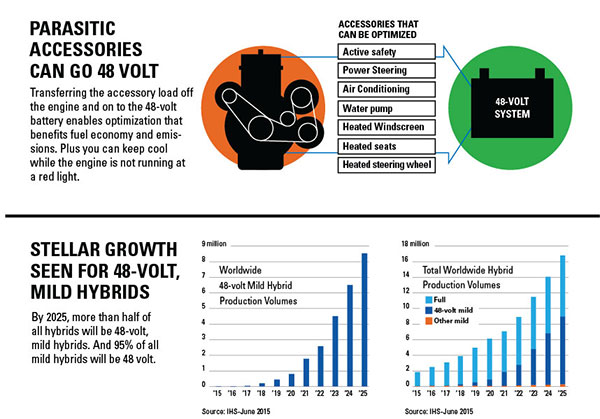 而且,更高的電壓和功率使得48V很有可能將用來驅動自動啟停系統(tǒng)以及作為混合動力車型中的電池系統(tǒng)。德爾福在今年年初的CES上展示了最新的48V系統(tǒng),雖然成本上升了30%,但可以將輕混車型的燃油經(jīng)濟性提升70%。