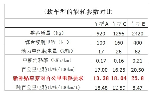 在此前流傳的討論稿中,純電動乘用車補貼標(biāo)準(zhǔn)中第一次引入的“噸百公里耗電量”,要求噸百公里電耗不超過13kWh,引人注目(參見:噸百公里電耗或?qū)⒊蔀槌擞密囇a貼標(biāo)準(zhǔn) 新政鼓勵大型車?)。經(jīng)理論上估算,整備質(zhì)量越高的車型,噸百公里耗電量數(shù)據(jù)反而越小,顯得更加節(jié)能。因此 “噸百公里耗電量”這項衡量指標(biāo)可能會限制小型電動車的發(fā)展,也有悖于新能源汽車輕量化技術(shù)發(fā)展路線。