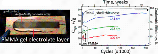 而Mya Le Thai則發(fā)現(xiàn)到,只要把納米線涂在二氧化錳上,再用類似塑膠玻璃(Plexiglas)凝膠包裹,就可以大大加強納米線的強度。加州大學(xué)化學(xué)系主任Reginald Penner 指:“僅通過使用這種納米線電容器(PMMA),充電池可以重覆充電幾十萬次而沒出現(xiàn)任何損耗。”而一般的充電池,最多只能重覆充電5000到7000次左右(或更少)在為期三個月的測試中,團隊把制成的電池重覆充電20萬次后,也沒法檢測任何功能上的損耗。