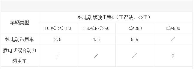 1、純電動乘用車100km≤R<150km每車2.5萬、150km≤R<250km每車4.5萬、R≥250km每車5.5萬元。