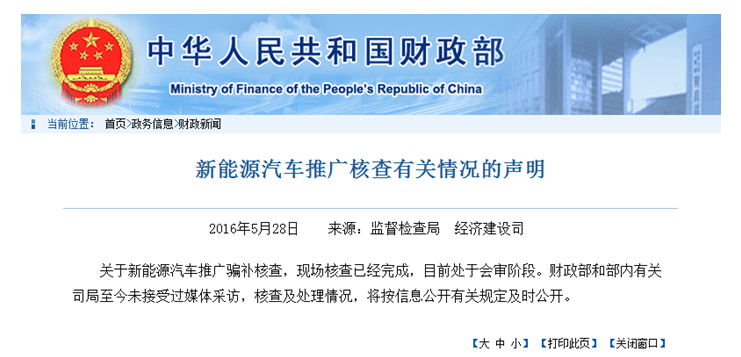 日前,財政部官網(wǎng)發(fā)布了一份關(guān)于新能源汽車騙補調(diào)查的聲明,聲明表示國務(wù)院關(guān)于新能源汽車推廣騙補的現(xiàn)場核查已經(jīng)完成,目前處于會審階段。財政部和有關(guān)部門尚未接受過任何媒體的采訪,具體核查及處理情況,有望近期公開。
