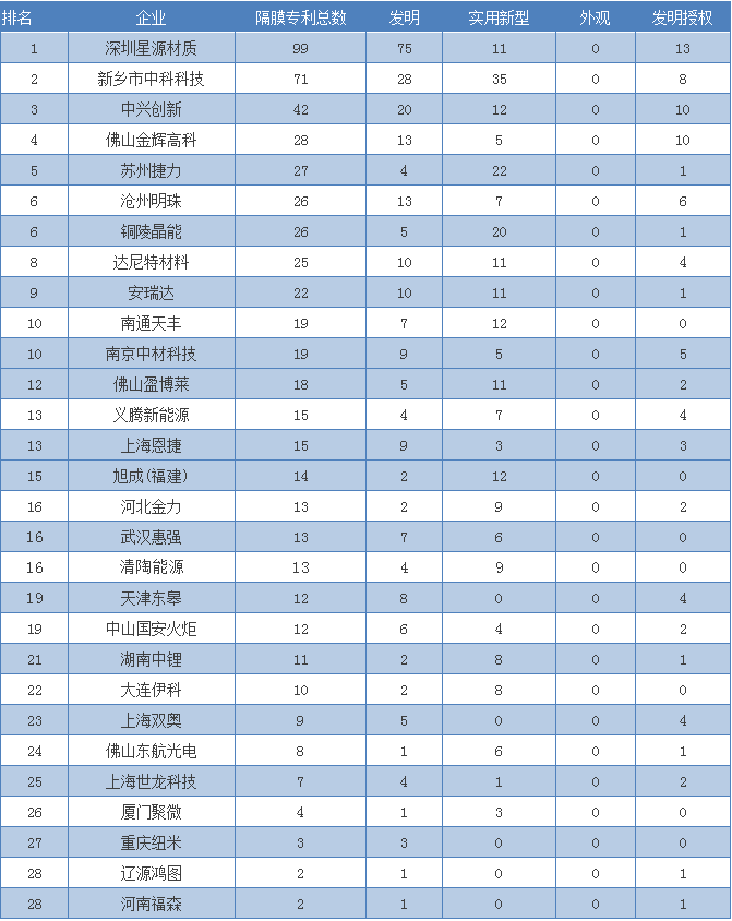中國鋰電池隔膜企業(yè)專利數(shù)量前十名企業(yè)分別為深圳星源材質、新鄉(xiāng)市中科科技、中興創(chuàng)新、佛山金輝高科、蘇州捷力、滄州明珠、銅陵晶能、達尼特材料、安瑞達、南通天豐、南京中材科技。