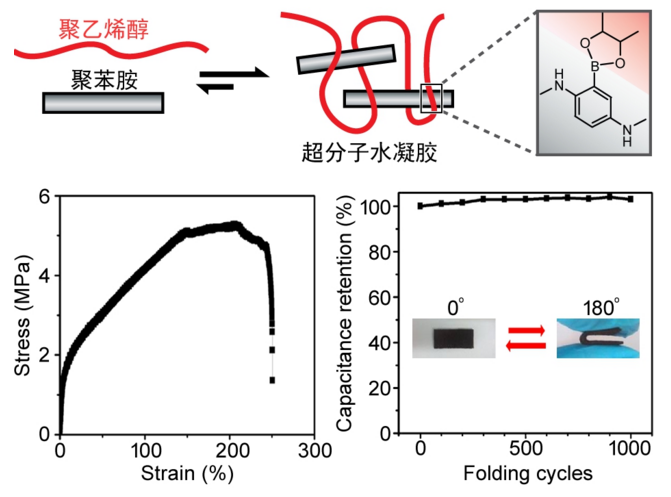 針對這一目標,馬明明課題組運用超分子結(jié)構(gòu)設(shè)計的原理,用硼酸酯鍵將剛性的聚苯胺和柔性的聚乙烯醇在分子水平上進行自組裝,形成具有三維動態(tài)網(wǎng)絡(luò)結(jié)構(gòu)的高強度電活性超分子水凝膠。該水凝膠的拉伸強度達到5.3 MPa,斷裂伸長率達到250%,在0.5 A/g的電流密度下,比電容值達到928 F/g,1000次充放電后的比電容保持率達到90%。該水凝膠的力學性能、電化學活性和穩(wěn)定性均大幅度超過現(xiàn)有的電活性水凝膠。將該水凝膠作為電極材料組裝成柔性全固態(tài)超級電容器,在0.25 A/g的電流密度下實現(xiàn)了153 F/g的比容量,1000次折疊后的比電容保持率達到100%,室溫存放7周后的比電容保持率達到93%。這一工作為設(shè)計新型柔性能量存儲器件提供了新思路。