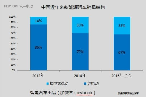 A級電動車的崛起是創(chuàng)變格局的主要原因,2016年純電動車市場中,A級車市場份額已提升至34%,插電式混動車市場更是清一色的中大型車唱主角。