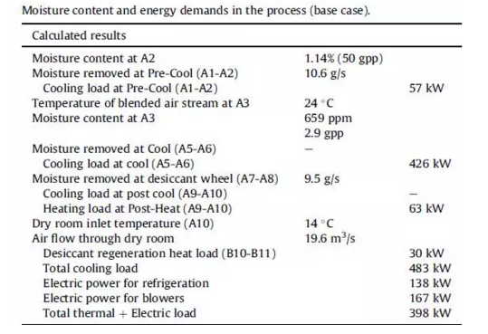 干燥間前端使用的氣體為33℃,相對濕度為50%或2.5vol%的空氣,首先這部分空氣被降溫到9℃,以便去除其中的水分,然后這部分干燥氣體,將會與干燥間排出的氣體進行混合,混合后的氣體溫度為24℃,濕度為0.07vol%,混合氣體會被再次降溫到10℃,然后混合氣體大部分(95%)會被送回到干燥間內,一小部分(5%)會被當作清洗氣流最終離開系統(tǒng),最終干燥間內部的濕度控制在15ppm左右,溫度控制在25℃。清洗流量低(5%)是該系統(tǒng)最大的優(yōu)點,這可以顯著的減少氣體降溫和加熱耗能。