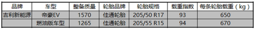另一種情況出現(xiàn)在了吉利帝豪EV上,在從燃油車打造為純電動之后,車輛整備質(zhì)量增加了305kg,但是車輛輪胎的載重系數(shù)卻由之前的94變?yōu)榱?3,由燃油版車型輪胎可最大承受重量的670kg變?yōu)榱?50kg,看似很不合理,不過仔細算下來,在車輛三輪著地的情況下,輪胎所能承受地最大載重為1950kg,即使?jié)M載5人,若每人60kg共300kg,加上整車1570kg的整備質(zhì)量,輪胎依然能夠承受,只不過車上的人員不能“太胖”。