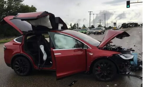 事故發(fā)生時(shí),一輛GMC Yukon闖紅燈,以45英里每小時(shí)的速度撞到了Model X車頭的右側(cè)。在車禍中,Model X的車身前頭被削掉,足見撞擊力度的猛烈。Model X的安全氣囊均及時(shí)打開,保護(hù)了車內(nèi)的乘員。