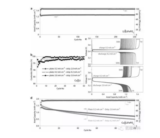 另外,該研究發(fā)現(xiàn)通過調節(jié)測試條件,也可提高庫倫效率。當鋰以0.2 mA cm-2沉積,2mA cm-2脫出時,平均庫倫效率可達99.6%,高于一直以0.2 mA cm-2/2mAcm-2進行循環(huán)的庫倫效率。